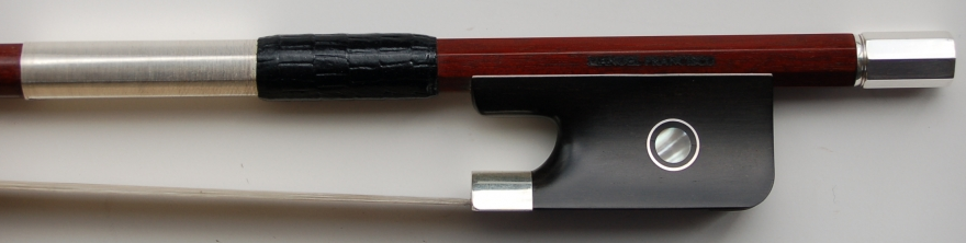 Aged Pernambuco wood; crafted after French bow-making school style, proprietary frog styling, lizard-leather thumb-grip, goldfish slide, solid silver or silver tinsel winding, bone tip, frog is finished by bowmaker himself.