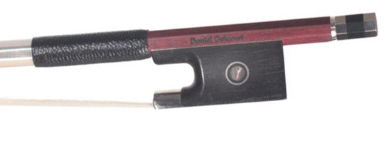 Aged Pernambuco wood; crafted after French bow-making school style, proprietary frog styling, lizard-leather thumb-grip, goldfish slide, solid silver or silver tinsel winding, bone tip, frog is finished by bowmaker himself.