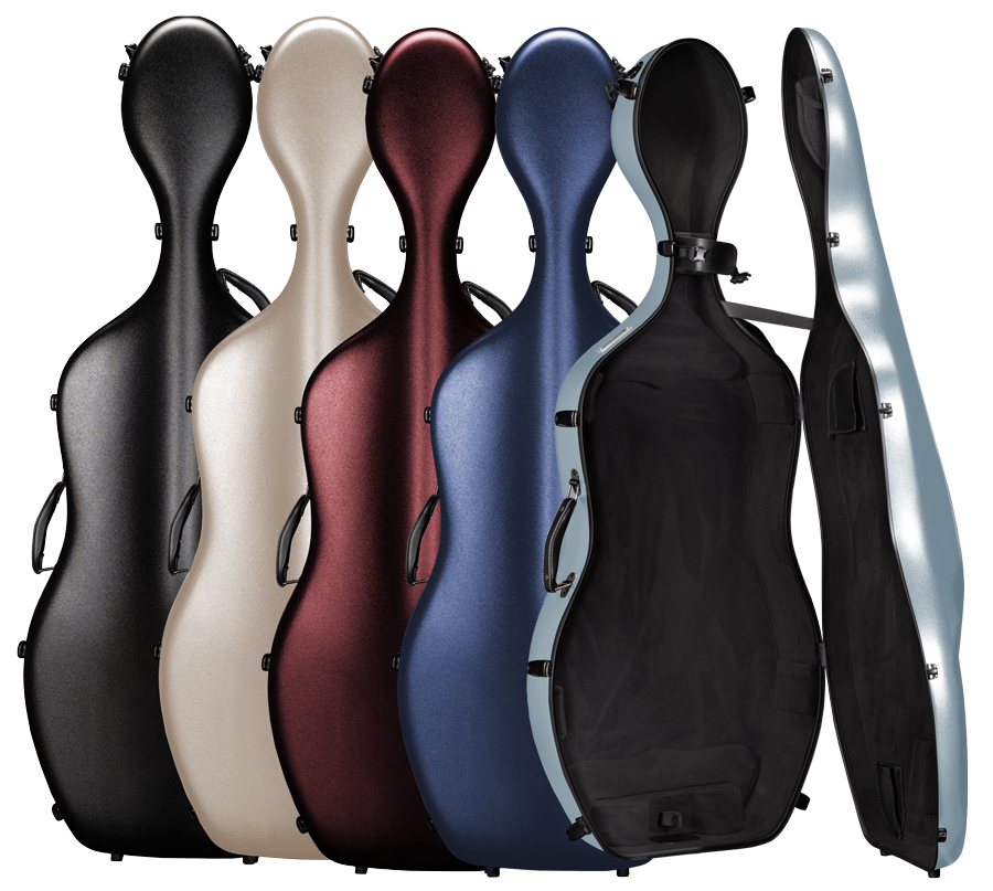 Fiberglass case with wheels. Available for 4/4, 3/4 and 1/2 size Cellos. Two straps for backpack carrying. Interior pocket. 13 Pounds. 7 latches for a weather-tight seal. Suspension padding. Two bow holders.
