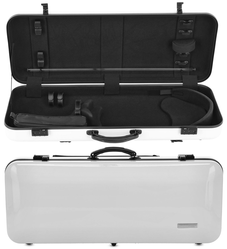 Composite shell suspension case. Screw-attached cover with music pocket. Instrument blanket, large accessory pocket, four bowholders, backpack straps, hygrometer and humidfier. Adjusts for instrument size via neck support that rides on track with contoured knob-adjustment. Adjustable for violas 15 - 16 1/2 inches. 7.7 pounds